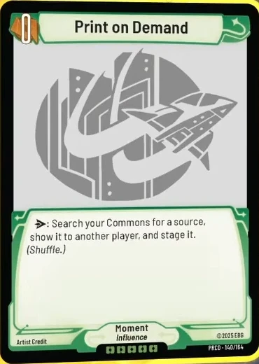 [action]: Search your Commons for a source, show it to another player, and stage it. (Shuffle.)